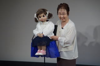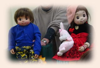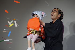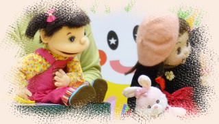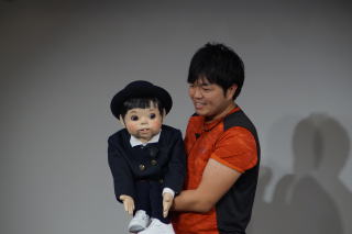 目玉を指に装着して、自分の名前と人形の名前を声を替えて